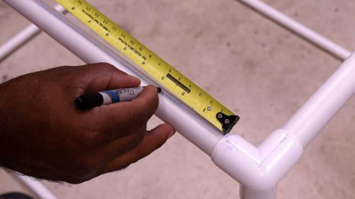 Начните с подготовки деталей. Разметьте полипропиленовую трубу на такие отрезки: по 79 см — 8 деталей, по 101,5 см — 3 детали и по одной детали 100 см, 93 см, 6 см и 4,5 см. Отрежьте детали с помощью ножовки по металлу.